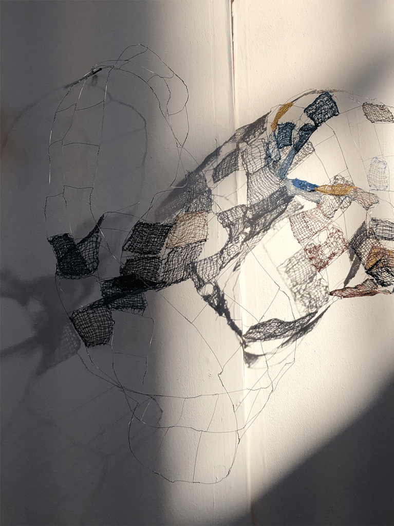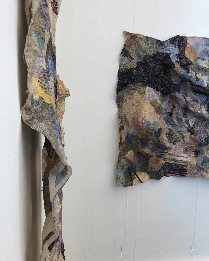 ‘Murmuration’ wire, thread, and shadow, dimensions variable, 2024‘Pour of tor’, embroidery on print of painting on recycled calico, 112cm x 180cm, 2024‘Pour of tor’, close up‘To save or savour?’, embroidery on digital print of paintings on recycled calico, 48 x 314cm, 2024‘To save or savour?’ close upInstallation shotInstallation shot